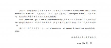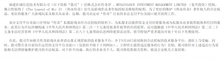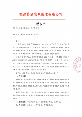 福建撲滿信息技術有限公司注冊地位于福建省福州市,是國內《熱血傳奇》客戶端游戲獨占性版權人。對《熱血傳奇》客戶端游戲擁有全部版權,并有權基于版權權利進行該游戲維權。株式會社傳奇IP (以下簡稱傳奇IP )對《The Legend of Mir 2》(中文名為“熱血傳奇"、或“傳奇”、“傳奇2”、“MIR II”)游戲(以下稱為 “授權作品”) 共同享有充分、完整且有效的著作權。經傳奇IP授權 , RENAISSANCE INVESTMENT MANAGEMENT LIMITED (以下簡稱 RENAISSANCE Ltd.)有權在中國大陸地區(qū)獨占性地對授權作品的網絡客戶端游戲進行開發(fā)、 發(fā)行、管理、宣傳、推廣和運營,針對授權作品的侵權游戲及侵權方,RENAISSANCE Ltd.有權采取必要的措施,并有權將前述權利分授權給第三人。福建撲滿信息技術有限公司經RENAISSANCE Ltd.授權,獲得上述權利,有權在中國大陸地區(qū)獨占性地對授權作品的網絡客戶端游戲進行開發(fā)、發(fā)行、管理、宣傳、推廣和運營,并有權對侵權行為/主體采取維權措施。